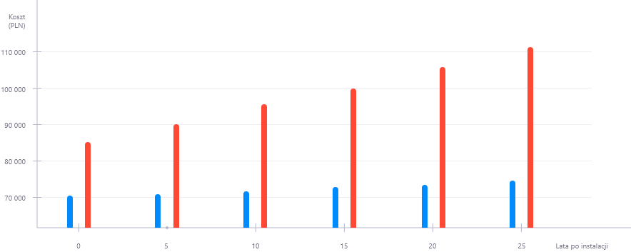 Porównaj koszty instalacji i eksploatacji. Wykres pokazuje szacowany koszt dla domku o powierzchni 150 m2 i średnim zapotrzebowaniu na energię elektryczną.
