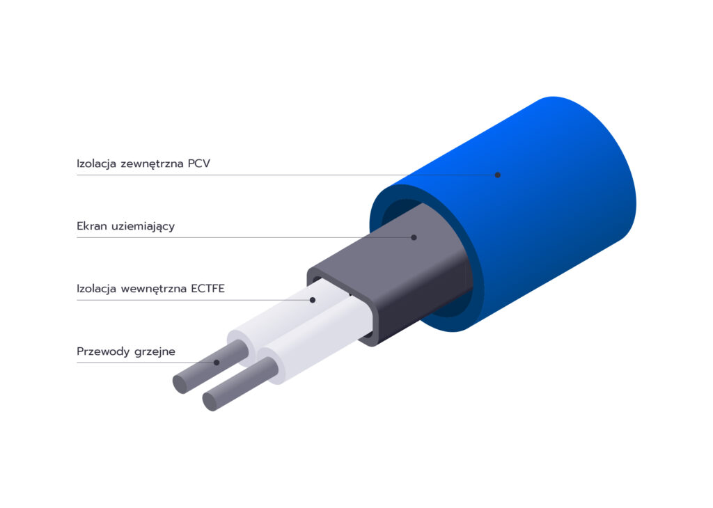 Proponowane przez nas kable to dedykowany brytyjski produkt stworzony specjalnie do celu ogrzewania. Chroniony jest przez kilka warstw izolacji oraz ekranu uziemiającego gwarantującego bezpieczeństwo użytkowania.